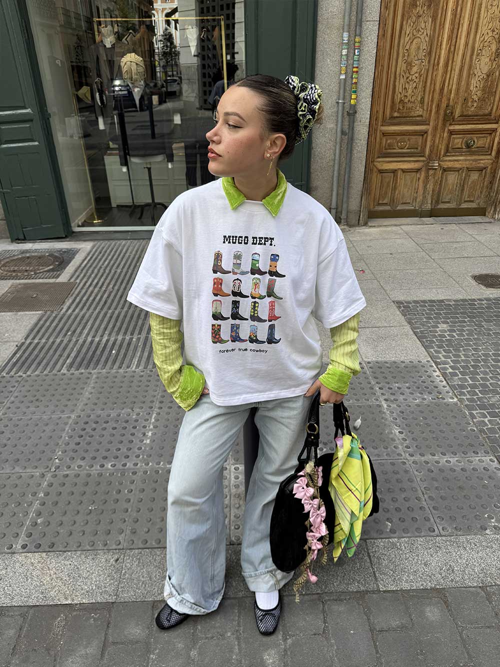 Cropped t-shirt made of 220 GSM 100% organic cotton with digitally printed cowboy boots on the chest and MUGO label stitched on the outside back.